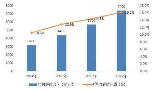 近年来,中国乡村旅游收入增长十分迅速,2017年,乡村旅游收入达到7400亿元,占国内旅游比重的16.2%。随着生活与经济水平提高,人们越发追求精神享受,回归自然,无疑对乡村旅游业的发展起巨大促进作用。